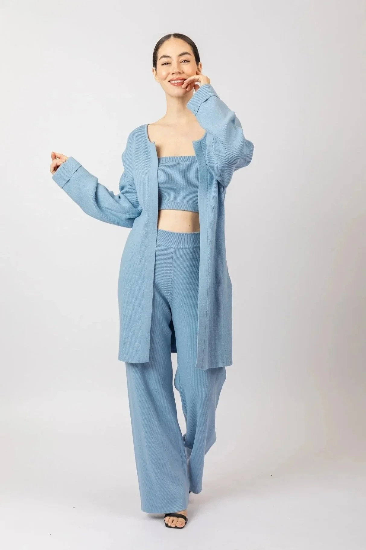 Stay cozy year-round in any season with the Queen Is The Title stylish collection of knit cardigans. You have the option of several colors blue, black, and camel. Each cardigan comes with a belt wrapped around in a perfect knot. Style the sweater anyway you see fit for your comfort, or pair it with the Queen Is The Title solid ribbed knit tube top and pants.